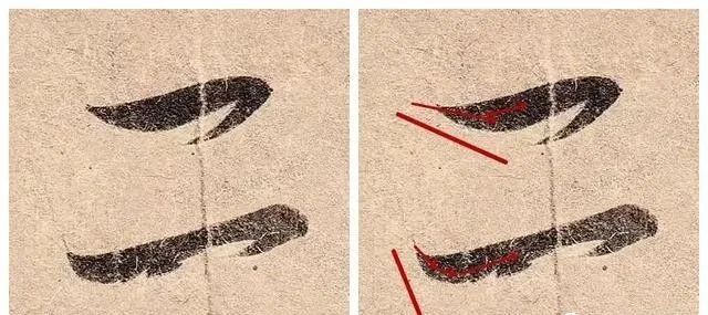 三橫的收筆方式也完全不同。二字第一橫的收筆是順勢提筆下行。第二橫的收筆則有明顯的提按調峰的動作,然后向斜下出鋒。