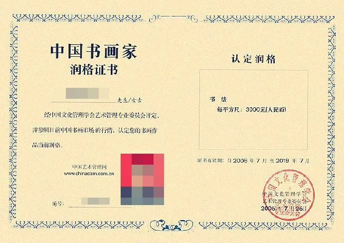 潤格證書在書畫市場中一直走俏,著實讓人費解。在網絡上,各種設計精美的潤格證書讓人大開眼界,這些名稱不一的證書,包含書畫家的姓名、照片,核心內容是認定潤格為每平方尺××元(或美元)。當然,少不了一個或幾個大紅印章,頒發機構是某書畫家協會、某認證中心,有的還帶有國徽圖樣,給人以官方、權威之感。