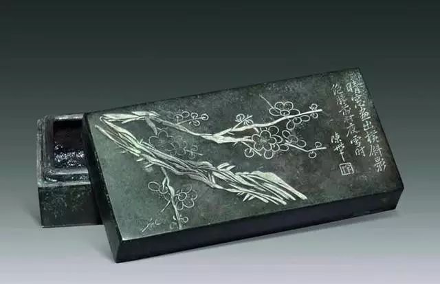 清震鈞《咫尺偶聞》云:“墨盒盛行,端硯日賤,宋代舊坑,不逾十金,賈人也絕不識,士大夫案頭,墨盒之外,硯臺寥寥。”可見這時銅墨盒已成為當時文人雅士的時髦之物。同時為追求古玩的韻味,對銅墨盒的制作開始講究,并著意在銅墨盒蓋及四周,以書畫設計和銅刻技巧,把刻銅作為一門藝術,一時刻銅墨盒的工藝盛行,水平也甚高,如“竹石圖”“二喬賞花”“王羲之觀鵝”“鳴春圖”“前赤壁賦”“桃花源記”“蘭亭序”等,應有盡有,各領風騷,真可謂百花齊放,不勝枚舉。到清末民國初年,一些官僚士紳、文人學士之間,興起一股贈送銅墨盒以增強友好之風氣,不可一世。如清代四朝元老,以理財著稱的東閣大學士、軍機大臣閻敬銘贈送親友的墨盒上鐫刻有閻氏書法,內嵌端石硯板,精致美觀,溫潤如玉,堪稱上乘之作。