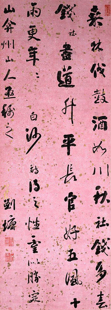 漲墨可以說在某種意義上與濕墨屬于同一墨法序列,只不過其主要的效果表現在筆之外,用漲墨書寫筆畫,其點畫中的水份多滲出點畫之邊緣,但點畫之用筆十分明顯,清人王鐸最擅此法。用漲墨,點畫中之濃墨雨點畫外之淡墨同構于一字或數字之中,有非常豐富的墨色變化。用此法,可以宿墨法相結合,往往在蘸濃墨后,筆尖蘸以清水,以滲化能力強的宣紙為之,頗有味道。