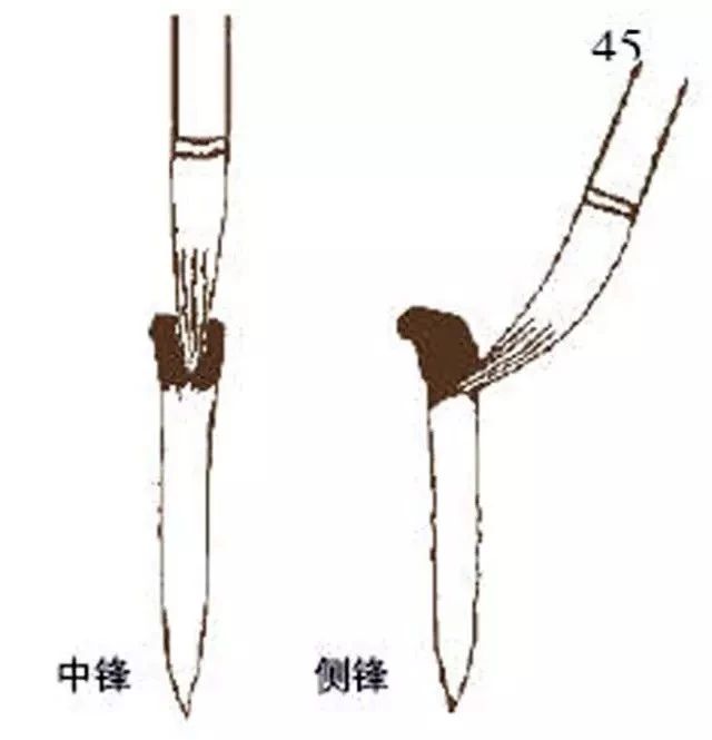 一是多用中鋒。中鋒就是書寫時直著筆桿,將主毫保持在要寫的筆畫的中央部分,其上的副毫就自然地落在其兩邊了。中鋒用筆,字中有骨,也顯得流暢、自然。與中鋒相對的是側鋒,它是將主毫偏在線條的一邊,顯得鋒利、險峻。