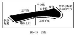 左半段略向上傾斜,與水平線的夾角在5°左右:右半段在行筆剛過左半段及時壓平,收筆時自然有拱形造型。