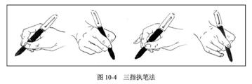 古人就十分重視執筆方法,執筆方法正確與否關系到筆的控側能力,運筆的靈活性、書寫的速度直接影響書寫的效果,良好的執筆方法必須從小暗養,否則一日形成習慣,糾正起來就很困難。正確的執筆方法常采用三指執筆法,如圖所示。