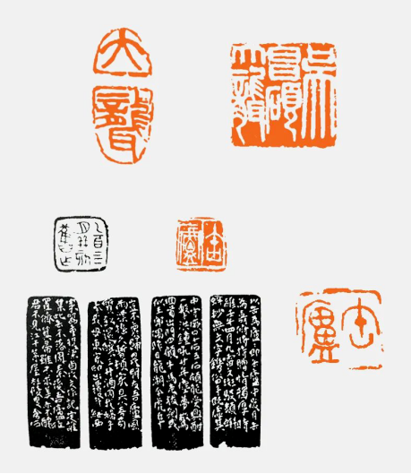 昌碩晚年,雙耳失聰,自號(hào)“大聾”,并把“大聾”二字手刻腰圓朱文印。我(鄭逸梅)喜集印拓,曾請(qǐng)昌碩哲嗣東邁鈴?fù)匾患?,藉以賞玩。昌碩榜其畫室為“缶廬”,因此又號(hào)“老缶”。