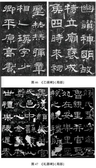 漢碑主要分“孔碑”和“功碑”兩種。請求設(shè)置孔廟守廟官職位的文書《乙瑛碑》(見如下圖),記載修飾孔廟和制造禮器等事的《禮器碑》(見如下圖),記述請求祭祀孔子和祭孔經(jīng)過的《史晨碑》,以及記述孔融父親辦事的《孔宙碑》、記述孔融叔父辦事的(孔彪碑》,均為“孔碑”。歌頌清官高尚品德及勤政愛民、為民辦好事、在戰(zhàn)爭中立了功的《石門頌》、《曹全碑》、《張遷碑》等,均為記功碑,即“功碑”。
