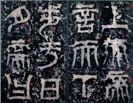 《天發(fā)神讖碑》,又名《天璽紀(jì)功碑》,傳為三國吳皇象所書。晉時折為三段,俗稱“三段碑”,嘉慶十年毀于火?,F(xiàn)故宮博物院藏有北宋拓本。在中國書法史上,《天發(fā)神讖碑》是一個非常奇特的碑刻。從書體上說,它非篆非隸,處在兩者之間。此碑用隸筆寫篆字,橫首用折刀頭、橫尾有波磔,豎尾用懸針,轉(zhuǎn)折用方,若懸崖斬斷,字勢雄偉。