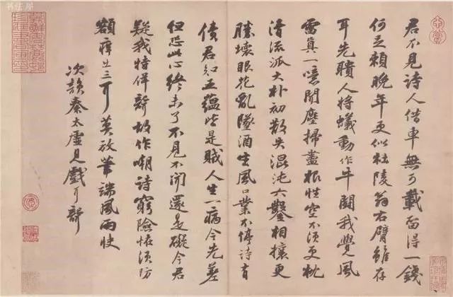米芾書法上不為法囿,下筆奇縱變幻,痛快淋漓,有風檣陣馬、快刀利劍之勢,《苦溪詩卷》《蜀素帖》是其杰作。