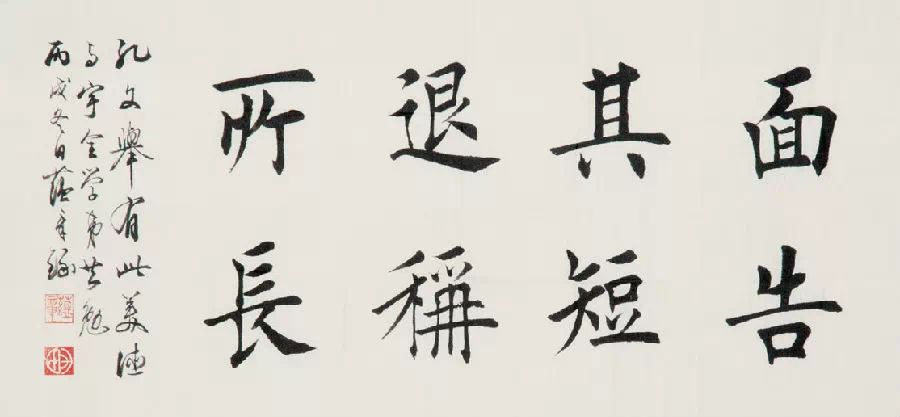 田老師的楷書,非常成熟,我們不多評論。但是落款處的行書,雖然寫的很“漂亮”、“秀氣”,但是,依然能看出楷書的筆法痕跡。這就說明,但一個人書法特點完全固定成型了的時候,想要變換是困難和存在瓶頸的。抑或說,田老師的行書,并沒有真正意義上,實現蛻變。