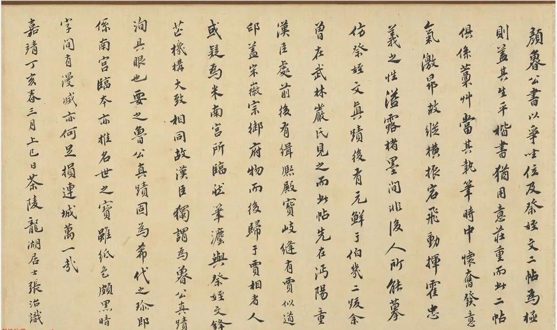 顏魯公書以爭坐位及祭姪文二帖為極則。蓋其生平楷書猶用意莊重。而此二帖俱系藳草。當其執筆時中懷奮發意氣激昂。故縱橫振宕飛動揮霍。忠義之性溢露楮墨間。非后人所能摹仿。祭姪文真跡后有元鮮于伯幾二跋。余曾在武林巖氏見之。而此帖先在沔陽童漢臣處。前后有緝熙殿寶。岐縫有賈似道印。蓋宋徽宗御府物而后歸于賈相者。人或疑為米南宮所臨。然筆灋與祭姪文鋒芒機構大致相同。故漢臣獨謂為魯公真跡洵具眼也。要之魯公真跡固為希代之珍。即系南宮臨本亦推名世之寶。雖紙色頗黑暗。字間有漫滅。亦何足損連城萬一哉。嘉靖丁亥春三月上巳日。茶陵龍湖居士張治識。