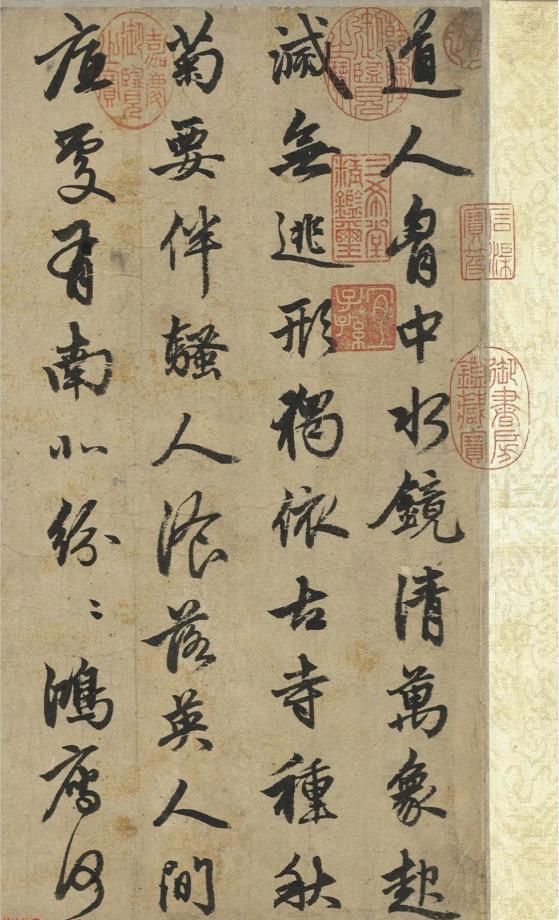 釋文:道人胸中水鏡清。萬象起滅無逃形。獨依古寺種秋菊。要伴騷人湌落英。人間底處有南北。紛紛鴻鴈何曾冥。閉門坐穴一禪榻。頭上歲月空崢嶸。今年偶出為求法。欲與慧劍加礱硎。雲衲新磨山水出。霜髭不翦兒童驚。公侯欲識不可得。故知倚市無傾城。秋風吹夢過淮水。想見橘柚垂空庭。故人各在天一角。相望落落如晨星(脫一字星)。彭城老守何足顧。棗林桑野相邀迎。千山不憚荒店遠。兩腳欲趂飛猱輕。多生綺語磨不盡。尚有宛轉詩人情。猿吟鶴唳本無意。不知下有行人行??针A夜雨自清絕。誰使掩抑啼孤惸。我欲仙山掇瑤草。傾筐坐歎何時盈。簿書鞭撲書填委。煮茗燒栗宜宵征。乞取摩尼照濁水。共看落月金盆傾。大德十年十月初。余謁中峯老師。適他出。與我月林上人話及東坡次韻潛師之語。出帋墨索書一通。以為禪房清供。呵呵。三教弟子趙孟頫記。