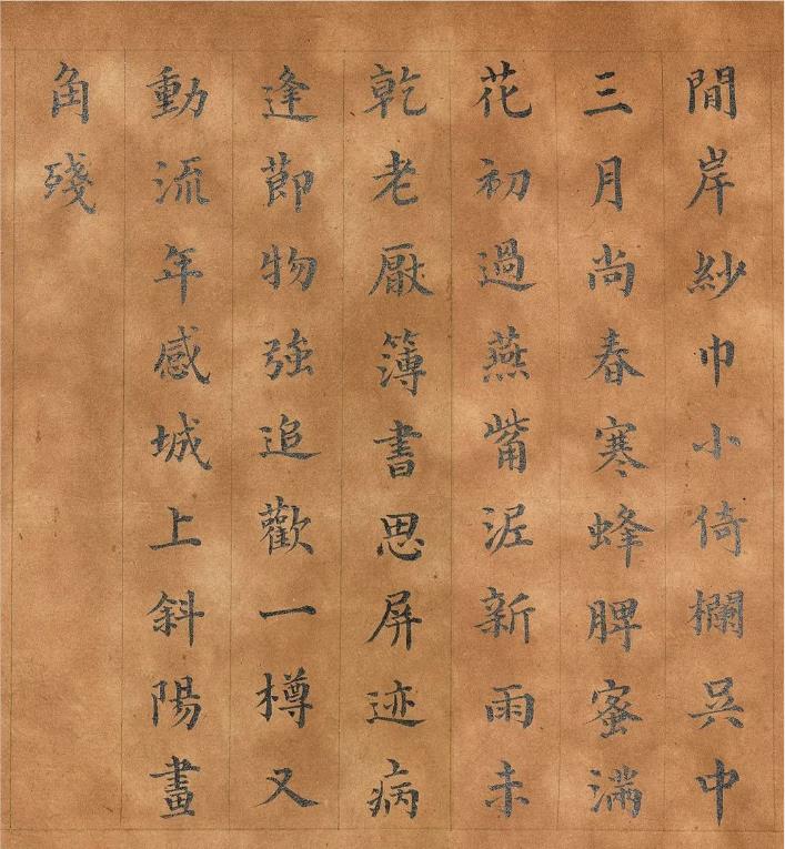 此卷為清宣宗於道光元年(1821)之楷書作品,內容抄寫南宋陸游的〈霜天晚興〉、〈倚欄〉、〈秋雨初霽試筆〉、〈舍北行飯書觸目〉、〈冬夜讀史有感〉、〈與兒輩泛舟遊西湖一日間陰晴屢易〉等詩作。用筆結字安穩,行氣平正,可看出清宣宗書寫時的認真。
