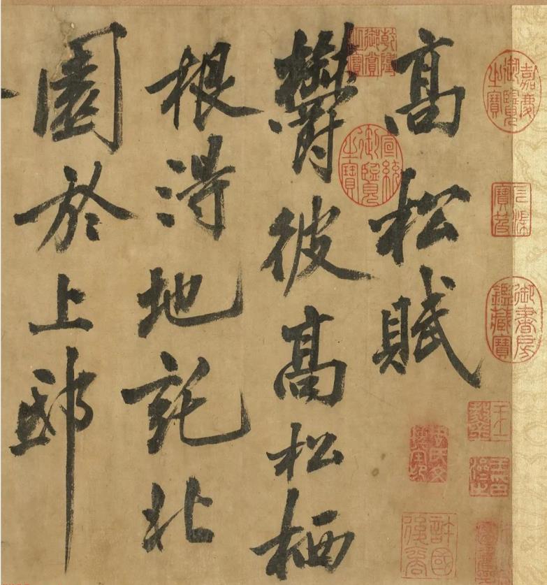 釋文:高松賦。鬱彼高松。棲根得地。託北園於上邸。依平臺而養翠。若夫蟠株聳幹之懿。含星漏月之奇。經千霜而得拱。仰百仞而方枝。朝吐輕煙薄霧。夜宿迷鳥覊雌。露雖滋而不潤。風未動而先知。既梢雲於清漢。亦倒景于華池。輕陰蒙密喬柯布護。葉斷禽蹤。枝通猿路。聽騷騷於既曉。望隱隱於將暮。暖平湖而漾青綠。拂繒綺而籠丹素。於時風急壟首。寒浮塞天。流蓬不息。明月孤懸。楻欒之竹可詠。鄒枚之客存焉。清都之念方遠。姑射之想悠然。擢柔情于蕙圃。涌寶思於珠泉。豈徒為善之小樂。離繳之短篇。若此而己乎。元祐二年(1087)冬十月。山谷道人黃庭堅書。