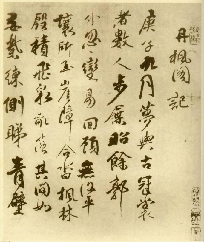 釋文:丹楓閣記。庚子九月,夢與古冠裳者數人,步屨昭餘郭外。忽忽變易,回顧無復平壤,所至崖障合沓,楓林殷積,飛泉亂落其間,如委紫練,側睇青壁,千仞如削,目致為窮也。其上長松密舉,而松末擁一閣,搖搖如一巢焉,顏曰丹楓,非篆非隸,嵌空一窗,億當閣逕,而蛛絲荒織,扃若終古矣。俄爾風水合住,塊然偃臥。遂經始閣材,構如其夢。莊生之言曰:有大覺而後知此其大夢也。戴生綴之曰:覺茍非覺,夢其奚靈?有大夢而後知其大覺也。 聞戴生之言者曰:是猶愁寐語也。是其言也,夢車馬而喜,夢酒肉而喜,夢糞穢而喜者,若覺而失之,窈窈焉幸其夢之兆,竊而不敢以為魄祟之顛倒者也。之入也,不可以入鼎彝、藏茶、藏酒,以待人之能入吾夢者。如其人之足夢,即不入吾之夢,吾當入其夢,又安知彼之不夢我之入其夢也。茍精誠之不通,超無有而獨存,戴生之夢不復堪此寥廓矣。
