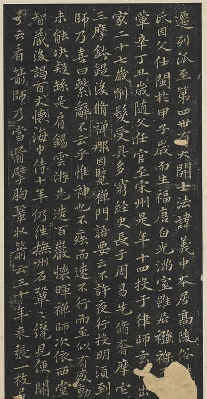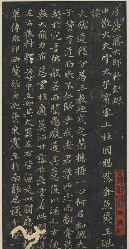 唐廣濟大師行錄碑。中散大夫守太子賔客上柱國賜紫金魚袋王渢譔。夫儒道釋分為三教。迺戒定慧。摠攝一心。何以知然。天子賛有道。而貶不仁。歸乎戒。老君尊沖虛。而鄙貪慾。契於定。吾佛般若。而闓愚癡。通其慧。復以漚和。方便敷大。願力布慈雲於廣莫。灑甘露於長空。若此則儒道左右扶持。釋尊中立如其大器。左右皆源。是以圓應頓機單傳......師有倡曰。只此見聞非見聞。無餘聲色可呈君。蓋言體用非分非不分也。離體別用。無真非假。自性自用。非真無假非真。則溪聲山色亦一真如況。從自性中自現。神化以育人民。超六道者猶有假乎。要其本源在彼而不在此。則水泡之指隱矣。王渢碑殺青于唐咸通。未及千年。壞而脩者三。今勒諸石庶永不壞。然而問師之真不壞。則其無生滅去來者也。東坡居士軾跋。