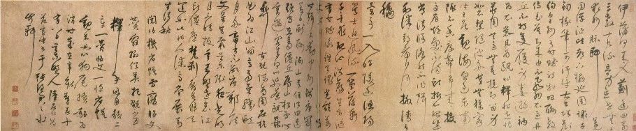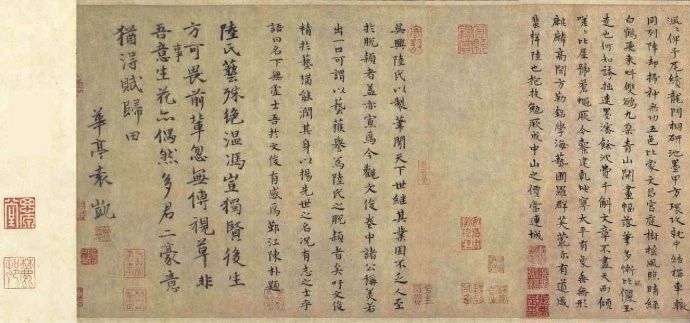 卷前鈐陸氏“云間”、“幽谷一叟”印2方;卷末鈐陸氏 “宅山”、“陸氏居仁”、“靜壽山”、“臥松亭”、“寄寄軒”款印5方。鑒藏印以項元汴、卞永譽、安岐三家最多,并有項氏“意字號”編號。《苕之水詩》卷書七言古詩一首,贊揚筆工陸文俊所制毛筆精良耐用,奪造化之功。據自署年款,此卷書于明洪武四年辛亥(1371年),是陸居仁晚年的草書精品。書法飄逸蒼秀,得張旭、懷素、孫過庭遺意。后幅有元代張樞楷書次韻陸詩并記,乃張樞傳世名跡。又有元代陳樸題跋、袁凱題詩各一段。此卷曾經清代乾隆內府、宣統內府收藏。