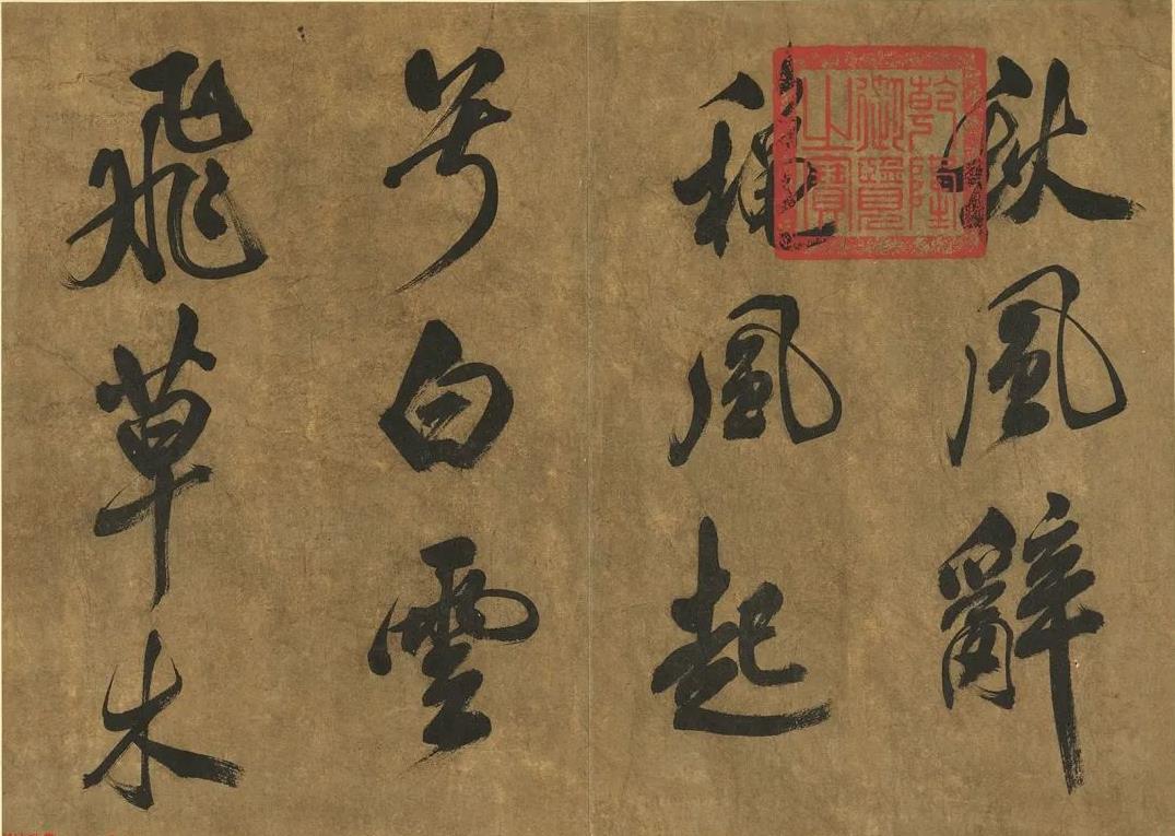釋文:秋風辭。龝風起兮白雲飛。草木黃落兮雁南歸。蘭有秀兮菊有芳。懷佳人兮不能忘。泛樓船兮濟汾河。橫中流兮揚素波。簫鼓鳴兮發櫂歌。歡樂極兮哀情多。少壯幾時兮奈老何。元章。