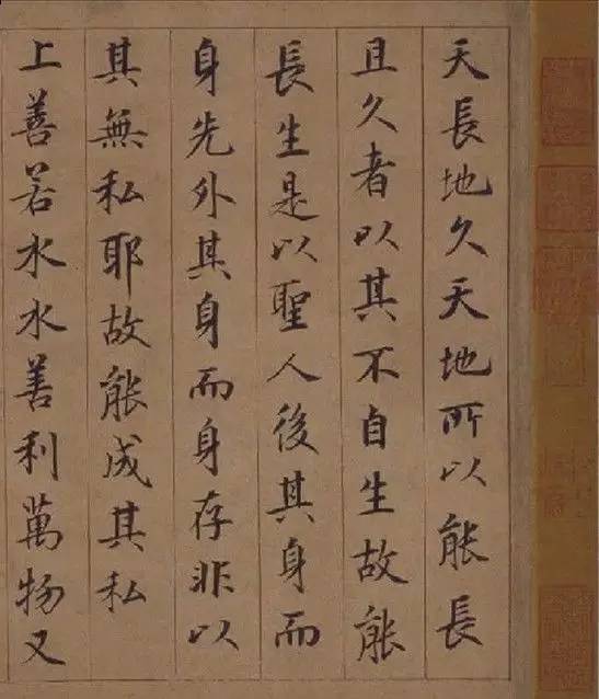 鮮于樞的這件傳世書法作品是他中年時期的楷書代表作,作品抄錄的是道家鼻祖老子的《道德經》原文。不過并不是全部抄錄,而是只抄錄上半部,且是從上半部的“天長地久”(第七章)開始。這件作品的書法是學唐代書法大家虞世南的風格,體態修長,筆法精美,清爽勁利,是鮮于樞唯一一件傳世的楷書書法長篇作品。