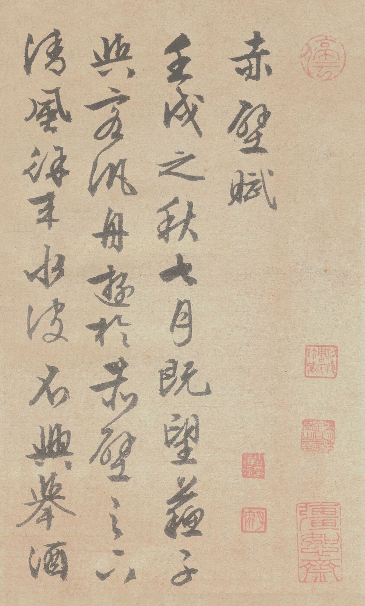 據題記年月,是文征明八十九歲時所書,距他逝世只有四個月。雖然他自己以為“筆尤不精,殊不成字”其實比之現在所見其他各種印本的《赤壁賦》,(一本,嘉靖二十一年壬寅七月十日作,點石齋??;一本,嘉靖二十九年庚戌七月作,有正書局?。灰槐?,嘉靖三十七年戊午二月既望作,原故宮印本,藝苑真賞社復??;一本,嘉靖三十年辛亥四月十六作,日本博文堂印本)都為精到。“瀟灑流落,翰逸神飛”可謂已至“人書俱老”的境地。