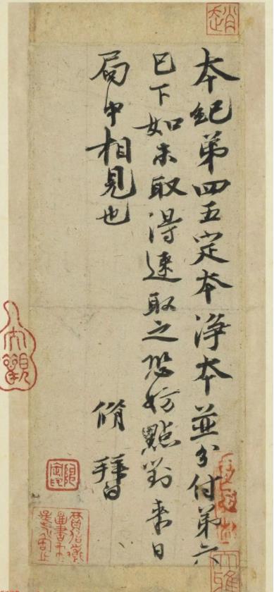 釋文:本紀弟四五定本凈本。并分付弟六已下。如未取得。速取之??址咙c對。來日局中相見也。修拜白。