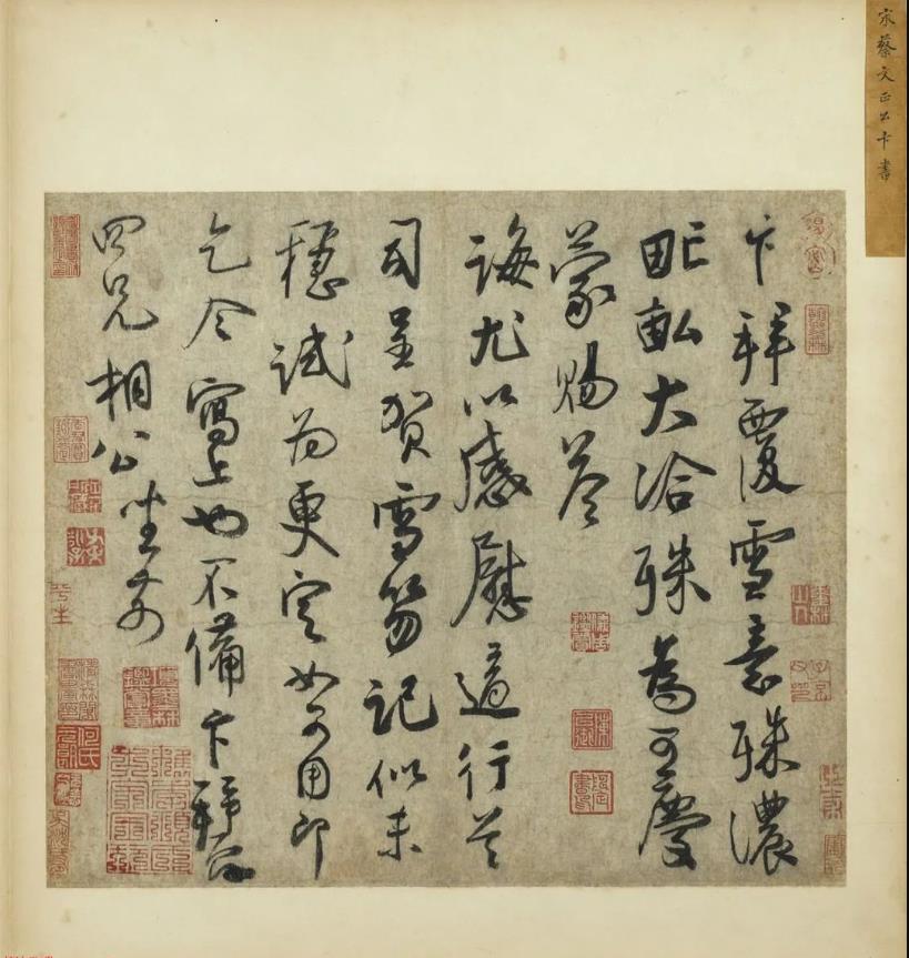《雪意帖》是其行草代表作。其入筆不一,豐富自然,各取其態。筆法純熟,撇處可見王羲之筆法。結體隨字而不一,但都神采奕奕。章法自然錯落有致,書體與米芾、蔡京相似,可能是他們互相學習的結果??疾毂彼文┠辏瑫鴫嗣总烙信畈獨庀笸?,尚有二蔡之書法亦煌煌大觀。蔡卞的《致四兄相公尺牘》,此卷蘊含禪機,筋脈舒展,神閑氣清,韻致婉潤,風雅縱逸,精神傳世。蔡卞尚意,在靈性之追求中,頗得筆法的蔡卞,與自出新意的蘇軾,高視古人的黃庭堅,蕭散奇險的米芾一樣,都在力圖表現自已作品標新立異的姿態,講究筆墨情趣,使學問之氣郁郁芊芊發于筆墨間,給人一種精神自由的審美意境。