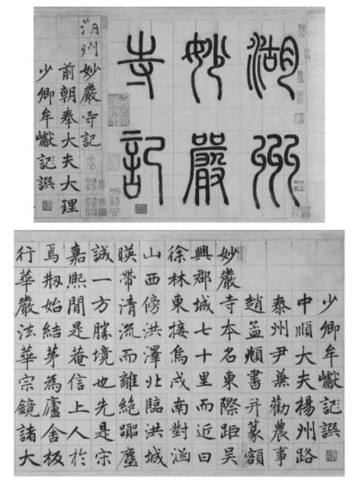 《妙嚴(yán)寺記》字跡勻稱,筆勢(shì)圓勁流麗,結(jié)構(gòu)布局端莊秀美,為趙孟煩楷書(shū)之代表作??瑫?shū)中帶有行意,動(dòng)靜相合。趙氏雖學(xué)二王為主,但他并不保守,眼界開(kāi)闊,借鑒古人甚多。尤其是行楷,一生效法李邕,以平正雅逸過(guò)之,這是一條中庸之道。觀此卷書(shū)法,是在用筆上,將晉唐各家精髓糅合得恰好之處,不露痕跡。二是結(jié)構(gòu)上規(guī)整有度,開(kāi)合適當(dāng)。三是風(fēng)格上剛?cè)嵯酀?jì),以柔為主,棉中有針。