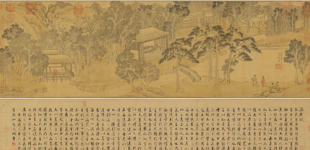 明代文徴明洛原草堂圖卷,絹本,設(shè)色,28.8x94厘米,故宮博物院藏。Ba1書法網(wǎng)-書法歷史_書法技巧_書法工具_(dá)書法風(fēng)格