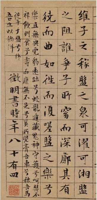 釋文:太行之陽(yáng)有盤谷。盤谷之間,泉甘而土肥,草木叢茂,居民鮮少?;蛟唬?ldquo;謂其環(huán)兩山之間,故曰盤。”或曰:“是谷也,宅幽而勢(shì)阻,隱者之所盤旋。”友人李愿居之......徵明書(shū)時(shí)年八十有四。