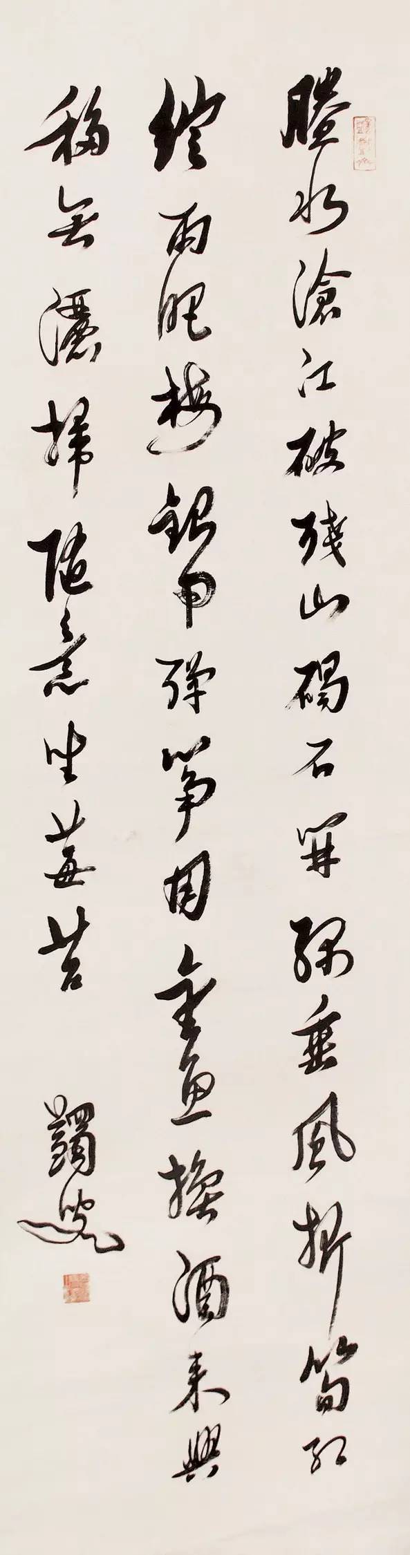 馬一浮早年學書以唐碑人手,尤喜愛歐陽父子,二十歲后遍臨魏晉南北朝書,植根于鐘王諸帖。兼用以唐賢骨法。“取北派之雄杰以充筋骨,而盡變其粗行之而貌,得南宗逸麗溫潤之韻致,而一洗其姿媚粉澤之態(tài)。’所以他的行草書碑帖交融,清稚高古。其結體堅緊,取勢側歌而險勁.但筆畫俊邁秀拔自成一格。